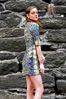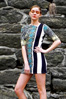 Contains: Rayon/cotton blend printed knit with striped detailing down the right side.