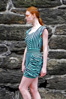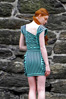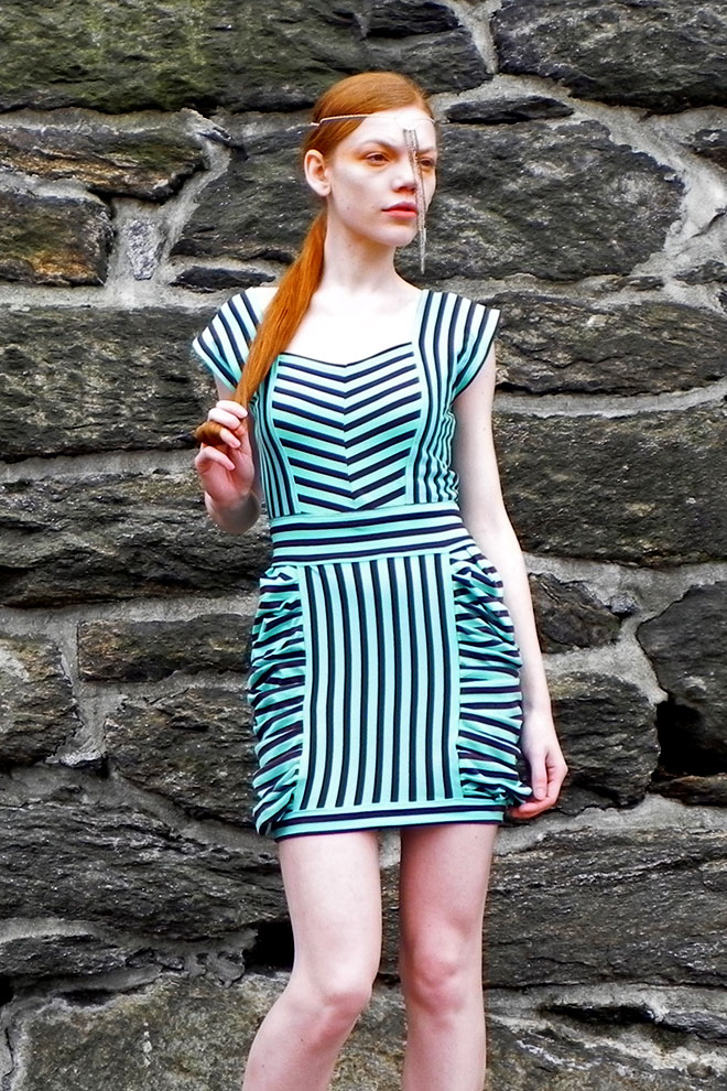 Contains: Short chocolate mint striped dress with rouging detail on skirt sides and play on lines with the top